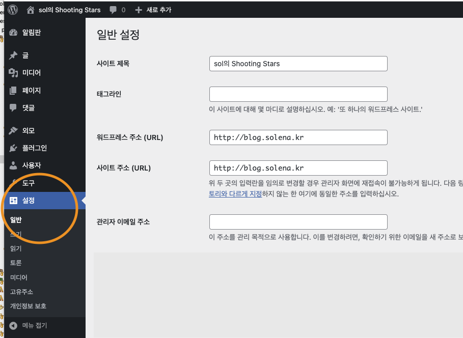 3. 워드프레스 주소, 사이트주소를 blog.solena.kr로 설정한다.