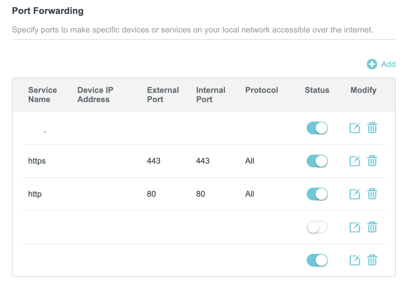 3. port Forwarding 으로 이동 후 80, 443 포트 추가