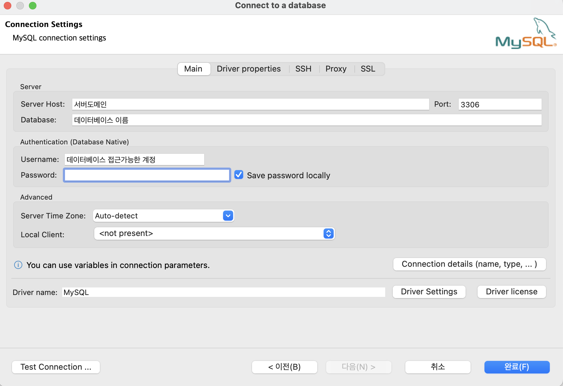 Username : Mysql에서 생성한 Database에 접근가능한 계정 입력