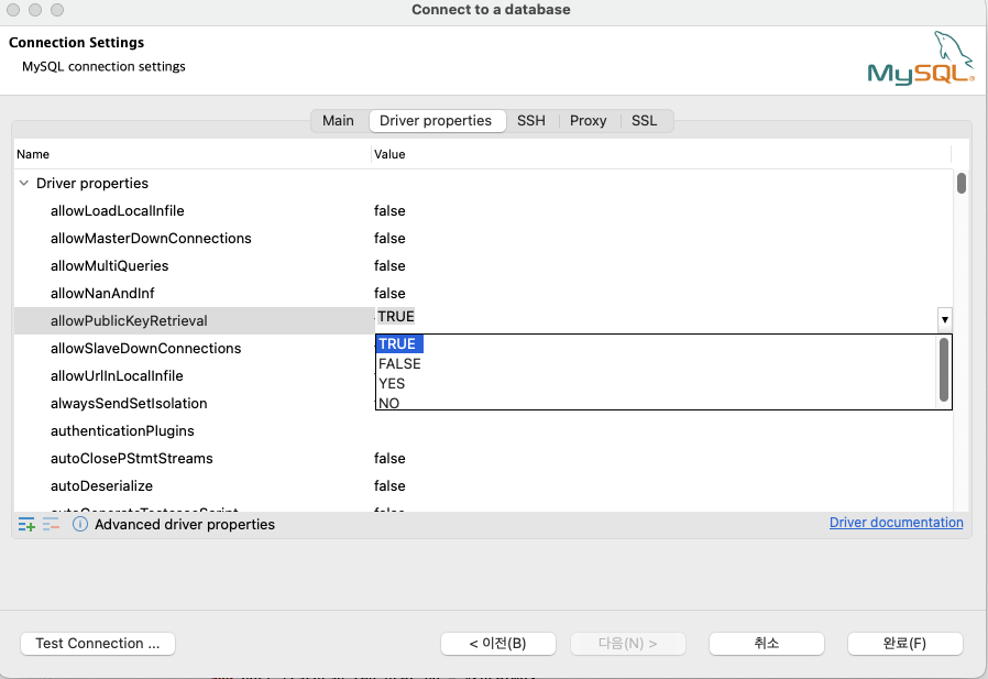 useSSL 이 false로 설정하고 allowPublicKeyRetrieval 설정이 되지 않은 경우라고 한다.